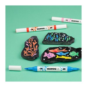 nekonečné možnosti kreativního tvoření s akrylovými popisovači Kores, které kombinují štětcový a kónický hrot, jsou ideální pro kreslení, psaní i práci s jemnými detaily, připravený k použití ihned, bez protřepávání, syté, intenzivní a krycí barvy, ideální pro světlé i tmavé povrchy, plynulý tok inkoustu, skvělý pro kreativní tvoření, vhodný pro dospělé i pro děti, netoxický, na vodní bázi, rychleschnoucí, vhodný na různé povrchy: kamínky, sklo, dřevo, papír, karton, plátno, plast, textil, keramika, porcelán