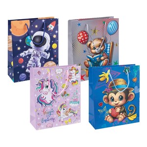 dárkové kvalitní tašky vhodné na většinu slavnostních příležitostí malých oslavenců, laminovaný lesklý povrch odolný proti oděru a poškození, atraktivní motivy, které skvěle doplní dárky pro nejmenší, barevně sladěné pevné šňůrky pro pohodlné přenášení, rozměry 25 × 30 × 10 cm, materiál lesklý laminát 210 g/m², mix 4 dětských motivů.
