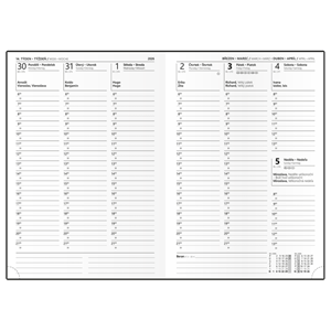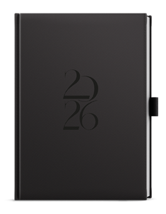 jemně strukturovaný matný materiál, jednostranná výplň desek, ražba roku, rovný hřbet, poutko na propisku v barvě potahu, české a slovenské jmenné kalendárium, dny a měsíce v 5 jazycích (CZ, SK, ANG, D, R), mezinárodní svátky, měsíční fáze, roční období, letní a zimní čas, místo na poznámky, formát 14,3 x 20,5 cm