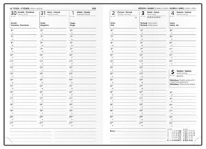 povrch diáře příjemný na dotek, zářivé barvy, moderní design, české a slovenské jmenné kalendárium, dny a měsíce v 5 jazycích (CZ, SK, ANG, D, R), mezinárodní svátky, měsíční fáze, roční období, letní a zimní čas, místo na poznámky, formát 14,3 x 20,5 cm