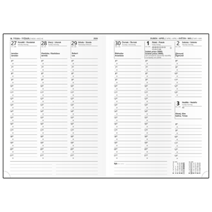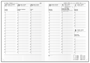 pololesklý jemně strukturovaný materiál, ražba roku přes stříbrnou pásku, oboustranná pěnová výplň desek, rovný hřbet, české a slovenské jmenné kalendárium, dny a měsíce v 5 jazycích (CZ, SK, ANG, D, R), mezinárodní svátky, měsíční fáze, roční období, letní a zimní čas, místo na poznámky, formát 20 x 20,8 cm