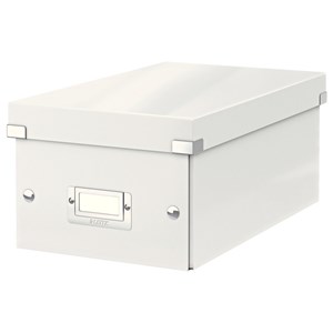 archivační krabice na DVD, skládací pro úsporu místa, když se nepoužívá, rámeček na popisovací štítek, laminovaný povrch pro lepší a trvalejší ochranu, kapacita ukládání 20 standardních nebo 40 tenkých obalů, rozměry 206 x 147 x 352 mm