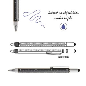multifunkční kuličkové pero 5v1, kuličkové pero, pravítko v cm i palcích, vodováha, plochý a křížový šroubovák, dotykový stylus pro tablety a smartphony, modrá náplň, inkoust na olejové bázi, černá barva, stiskací mechanika, balení v blistru, rozměry 155 × Ø 13 mm