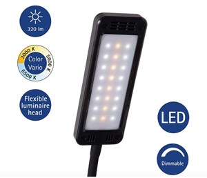 stmívatelná stolní LED lampa, dotyková, flexibilní rameno umožňující nastavení různého úhlu dle potřeby uživatele, barva světla a svítivost nastavitelná ve 3 stupních v závislosti na denní době a osobní potřebě, energetická třída D (spektrum A-G), váha 0,670 kg, rozměry 26,5 x 10,6 x 37,5 cm, černá