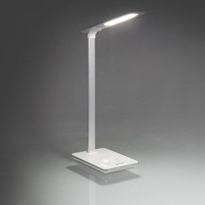 atraktivní stolní lampa s bezdrátovým (Qi) nabíjením a USB výstupem, 48 LED čipů Epistar 4014 (5 W, 250 lm), volitelná teplota světla 3000K / 4000K / 5000K / 6000K, CRI > 80, dotykové ovládání a kroková regulace jasu, časovač 60 / 90 min, nastavitelná hlava 180° a rameno 90°, životnost až 50 000 hodin, napájení DC 5 V / 2500 mA (adaptér součástí), účinnost nabíjení 75 %, nabíjecí vzdálenost 8 mm, barva bílá