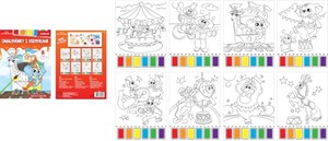 omalovánky s vodovkami obsahují 8 veselých obrázků s motivem, každý obrázek má v dolní části 6 vodových barev (červenou, oranžovou, žlutou, modrou, zelenou a fialovou), balení obsahuje také malířský štětec, omalovánky mají formát A4
