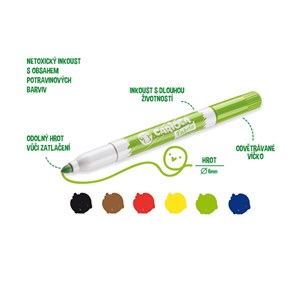 textilní fixy Carioca, extra silný hrot ø 6 mm pro snadné vyplnění ploch, určené na textil, po aplikaci permanentní, netoxické, jasné a zářivé barvy, odolné vůči praní až do 60 °C, odvětrávané víčko, vyrobeno v Itálii, obsah balení 6 ks, nevhodné pro děti do 3 let