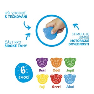 roztomilé voskovky ve tvaru medvídka, ideální pro děti od 12 měsíců, ergonomický tvar podporuje správný úchop a usnadňuje první kreativní pokusy, každá barva spojena s emocí pro zábavu a poznávání, uši medvídka tvoří hravé tečky, široká část umožňuje kreslit dlouhé tahy, jasné a zářivé barvy, podpora nácviku úchopu a rozvoj motoriky, neobsahuje TiO2, obsah balení 48 ks