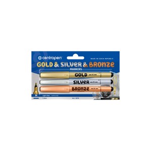 sada univerzálních popisovačů v oblíbených barvách stříbrná, zlatá a bronzová, ERGO držení, ideální pro psaní, kreslení a dekorování na tmavých i světlých papírech, inkoust je permanentní na papíře a porézních materiálech a částečně permanentní na skle, kovech a plastech, světlostálý, válcový hrot, šířka stopy 1 mm, skladovat ve vodorovné poloze